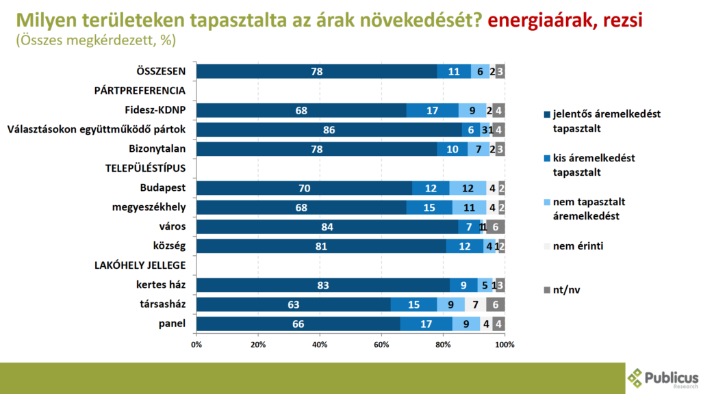 A választásokon együttműködő ellenzéki pártok szavazói közül tízből közel kilenc (86 százalék), tízből nyolc (78 százalék) bizonytalan szavazó, illetve tízből hét (68 százalék) Fidesz szavazó tapasztalt jelentős áremelkedést az energiaárak, a rezsi kapcsán.
