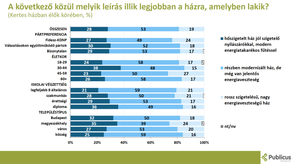 A kertes házban lakók közül minden ötödik (19 százalék) megkérdezett mondta azt, hogy rossz szigetelésű, nagy energiaveszteségű házban lakik. Minden második (53 százalék) válaszadó nyilatkozott úgy, részben modernizált házban lakik, de még van jelentős energiavesztesége. Tízből három (28 százalék) megkérdezett mondta azt, hogy hőszigetelt házban lakik jól szigetelő nyílászárókkal, modern energiatakarékos fűtéssel.