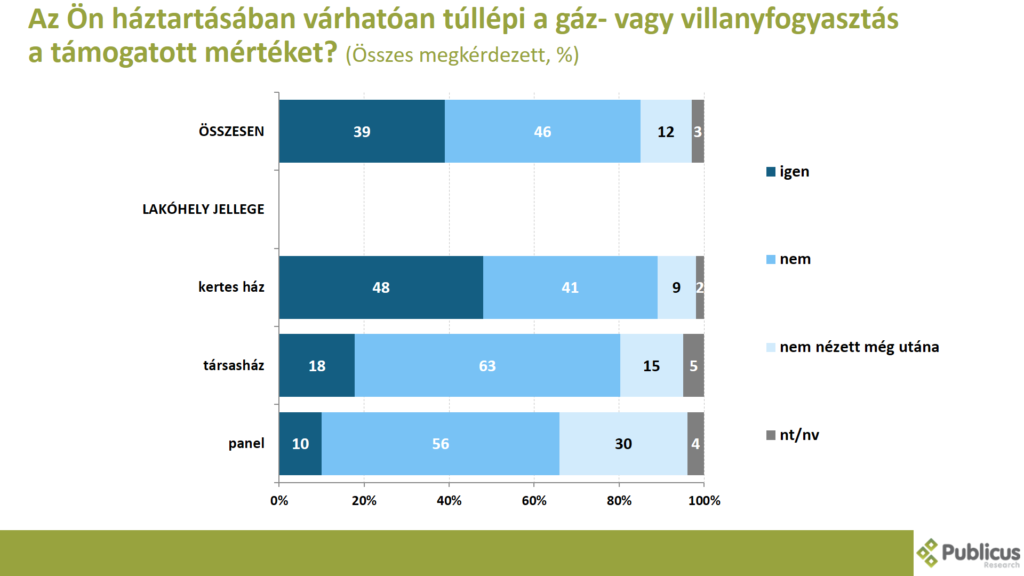 A megkérdezettek 39 százaléka mondta azt, hogy a háztartásában túllépi a gáz- vagy villanyfogyasztás támogatott mértékét. [2022 augusztusában 43 százalék, 2022 júliusában pedig még 56 százalék volt ez az arány.] Leginkább a kertes házban élők (48 százalék) nyilatkoztak így.