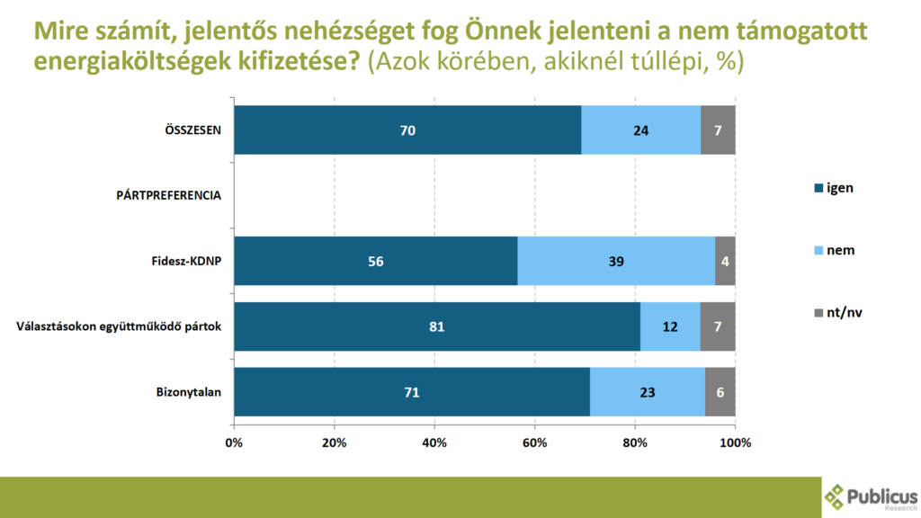 Azok körében, akik túllépik a fogyasztás államilag támogatott mértékét, tízből hét (70 százalék) megkérdezett arra számít, hogy jelentős nehézséget fog neki jelenteni a nem támogatott energiaköltségek kifizetése. Ezt mondta a választásokon együttműködő ellenzéki pártok szavazói közül tízből nyolc (81 százalék), tízből hét (71 százalék) bizonytalan szavazó, illetve tízből közel hat (56 százalék) Fidesz szavazó.