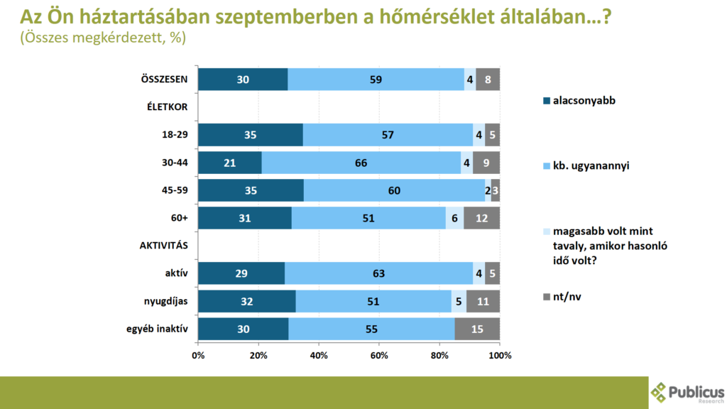 Tízből három (30 százalék) megkérdezett mondta azt, hogy az ő háztartásában szeptemberben a hőmérséklet általában alacsonyabb volt, mint tavaly, amikor hasonló idő volt. Leginkább a 18-29 év közöttiek és a 45-59 év közöttiek mondták ezt (35-35 százalék), illetve a nyugdíjasok (32 százalék).