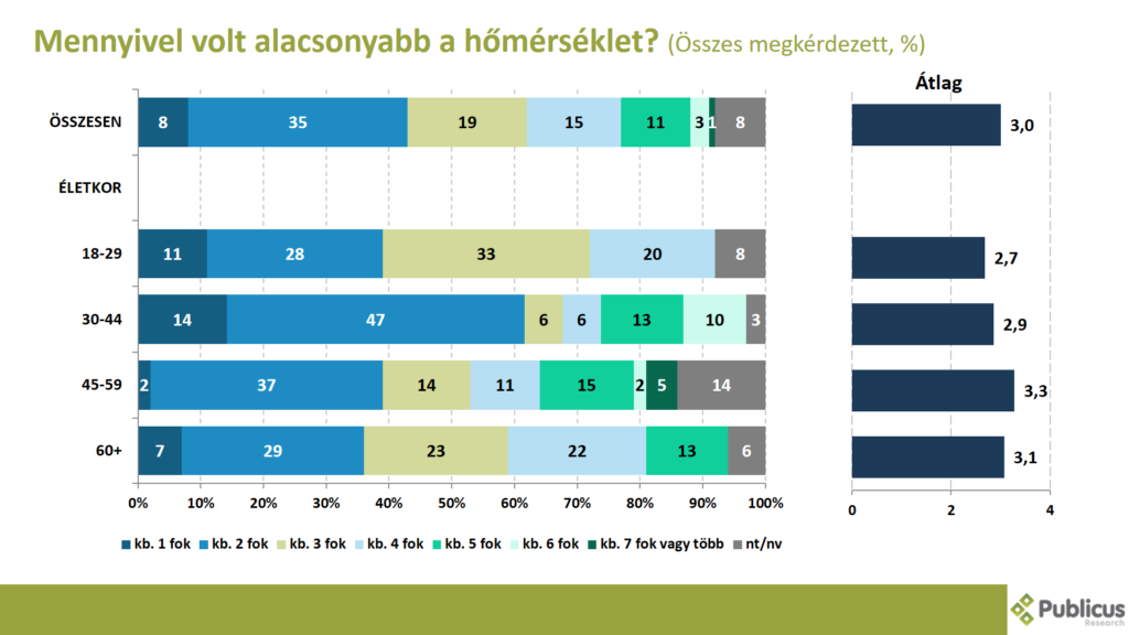 A megkérdezettek háztartásában átlagosan 3 fokkal volt alacsonyabb a hőmérséklet. [Közel minden tizedik (8 százalék) válaszadó 1 fokkal, minden harmadik (35 százalék) 2 fokkal, minden ötödik (19 százalék) 3 fokkal, minden hetedik (15 százalék) 4 fokkal, minden tizedik (11 százalék) 5 fokkal, 4 százaléknyi megkérdezett pedig 6 fokkal vagy annál többel csökkentette a hőmérsékletet a háztartásában.