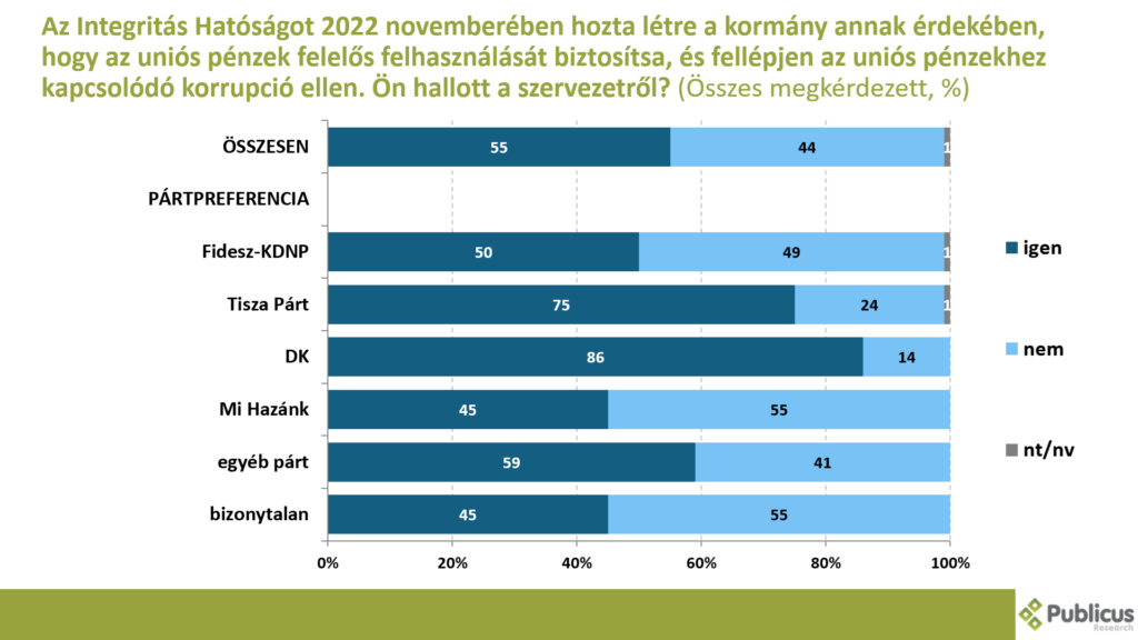 Az Integritás Hatóságot 2022 novemberében hozta létre a kormány annak érdekében, hogy az uniós pénzek felelős felhasználását biztosítsa, és fellépjen az uniós pénzekhez kapcsolódó korrupció ellen. A válaszadók többsége (55 százalék) hallott a szervezetről. Leginkább a DK és a Tisza Párt szavazói nyilatkoztak így (86 és 75 százalék), illetve a Fidesz szavazóknak a fele (50 százalék) mondta még ezt.