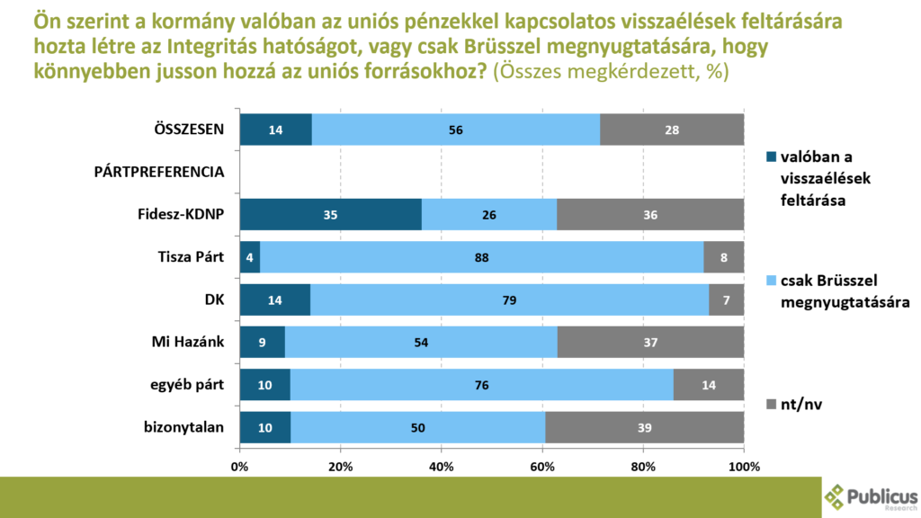 Tízből közel hat (56 százalék) megkérdezett szerint csak Brüsszel megnyugtatása miatt hozta létre az Integritás Hatóságot, hogy könnyebben jusson hozzá az uniós forrásokhoz. Így gondolja a Tisza Párt szavazóinak a 88 százaléka, a bizonytalan szavazók fele (50 százalék), illetve a Fidesz szavazók 26 százaléka.