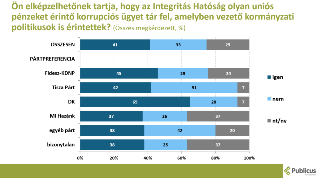 Tízből négy (41 százalék) válaszadó elképzelhetőnek tartja, hogy az Integritás Hatóság olyan uniós pénzeket érintő korrupciós ügyet tár fel, amelyben vezető kormányzati politikusok is érintettek. Ezt mondta a DK szavazók kétharmada (65 százalék), a Fidesz szavazók 45 százaléka, a Tisza Párt szavazóinak 42 százaléka, illetve a bizonytalan szavazók 38 százaléka.