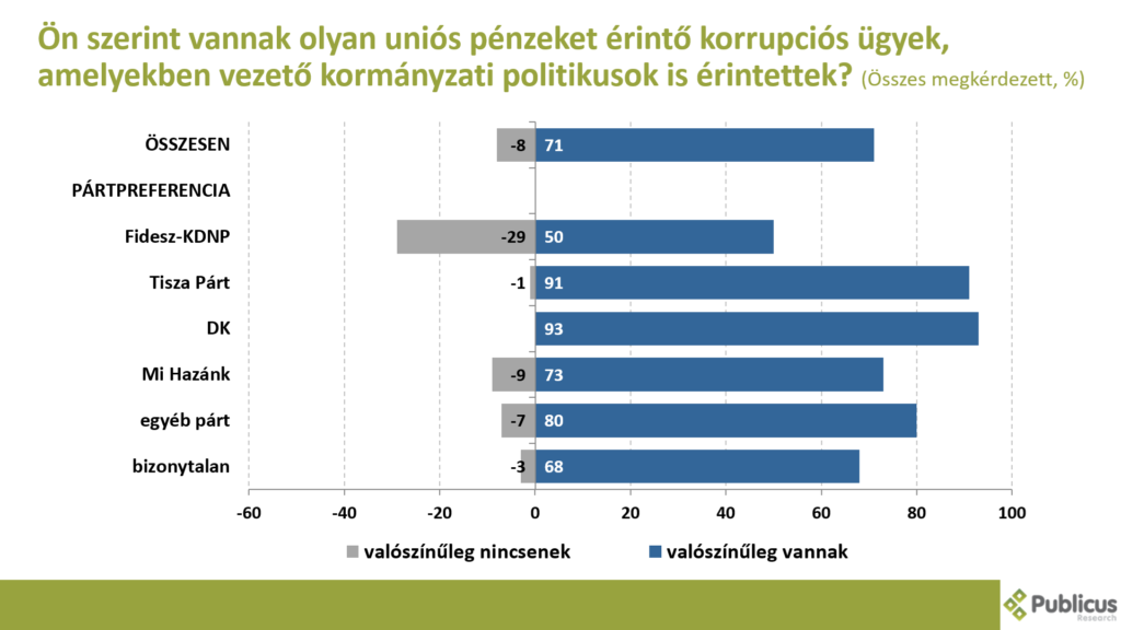 Tízből hét (71 százalék) megkérdezett szerint vannak olyan uniós pénzeket érintő korrupciós ügyek, amelyekben vezető kormányzati politikusok is érintettek. Így nyilatkozott a Tisza Párt szavazóinak a 91 százaléka, a bizonytalan szavazók 68 százaléka, illetve a Fidesz szavazók 50 százaléka.