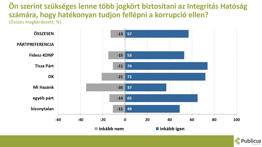 Tízből hat (57 százalék) válaszadó szerint szükséges lenne több jogkört biztosítani az Integritás Hatóság számára, hogy hatékonyan tudjon fellépni a korrupció ellen. Így gondolja a Tisza Párt szavazóinak a háromnegyede (74 százaléka) a Fidesz szavazók enyhe többsége (53 százalék), illetve minden második (49 százalék) bizonytalan szavazó.