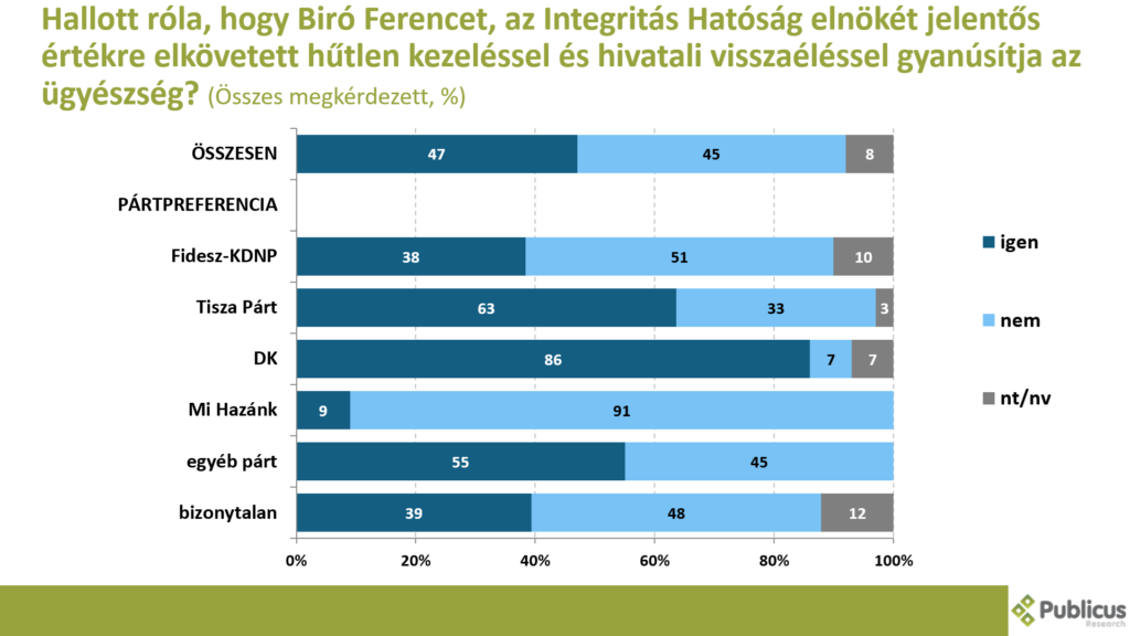 Minden második (47 százalék) megkérdezett hallott róla, hogy Biró Ferencet, az Integritás Hatóság elnökét jelentős értékre elkövetett hűtlen kezeléssel és hivatali visszaéléssel gyanúsítja az ügyészség. Ezt mondta a DK szavazóinak a86 százaléka, a Tisza Párt szavazóinak a 63 százaléka, a bizonytalan szavazók 39 százaléka, illetve a Fidesz szavazók 38 százaléka.