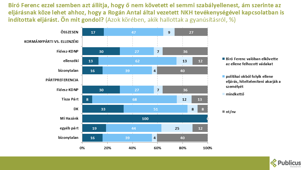 Biró Ferenc ezzel szemben azt állítja, hogy ő nem követett el semmi szabályellenest, ám szerinte az eljárásnak köze lehet ahhoz, hogy a Rogán Antal által vezetett NKH tevékenységével kapcsolatban is indítottak eljárást. Azok körében, akik hallottak a gyanúsításról, minden második (47 százalék) válaszadó szerint politikai okokból folyik ellene eljárás, és hitelteleníteni akarják személyét. Így látja a Tisza Párt szavazóinak a 68 százaléka, a bizonytalan szavazók 39 százaléka, illetve a Fidesz szavazók 27 százaléka is.