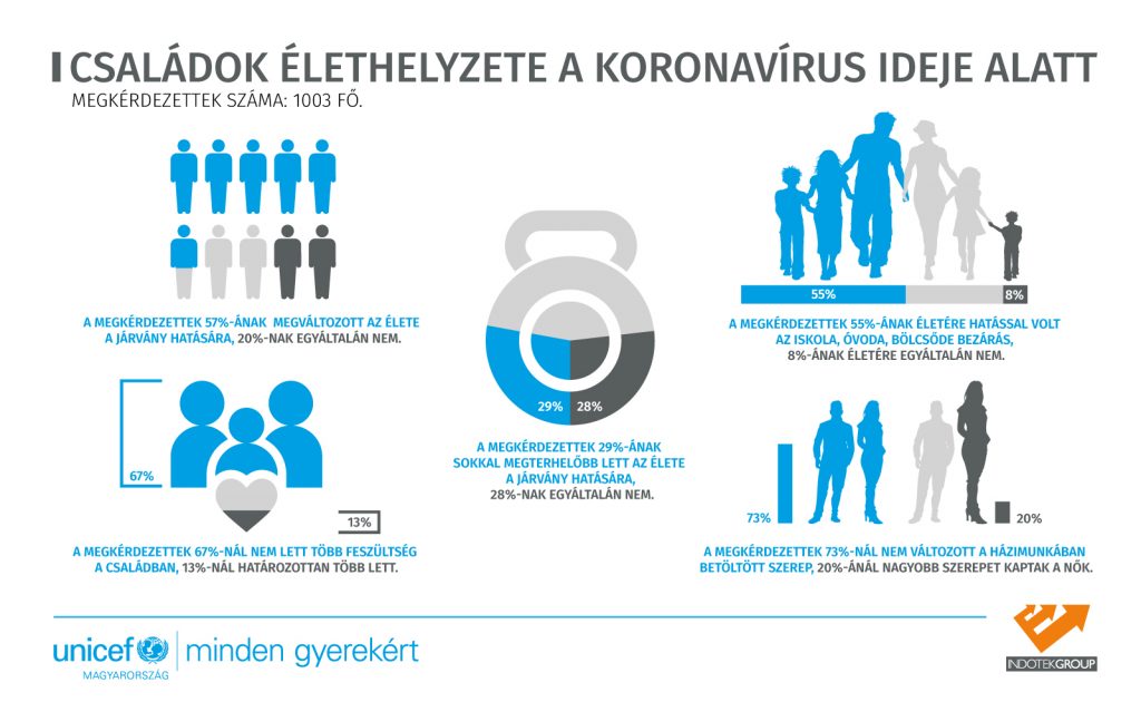 A lakosság többsége lelkileg megterhelőnek érezte a járvány miatt kialakult helyzetet, amely számos változás mellett sok esetben a családon belüli feszültség megnövekedésével és az otthoni munkamegosztás arányainak eltolódásával járt együtt – utóbbi mértékéről másként vélekednek a nők és férfiak. Többek között erre világított rá az UNICEF Magyarország és az Indotek Group közös, a Publicus Intézet által készített, 1003 főt magába foglaló reprezentatív felmérésében. Az UNICEF Magyarország az Indotek Group és a Publicus Intézet korábban már végzett kutatást a kisgyermekes anyák munkaerőpiaci helyzetének társadalmi megítélésével kapcsolatban, ennek kiegészítéseként készült el a mostani, a járványhelyzet társadalmi hatásait vizsgáló felmérés.