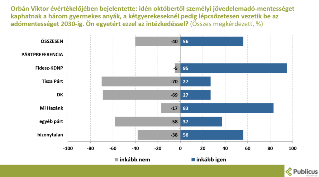 Orbán Viktor évértékelőjében bejelentette: idén októbertől személyi jövedelemadó-mentességet kaphatnak a három gyermekes anyák, a kétgyerekeseknél pedig lépcsőzetesen vezetik be az adómentességet 2030-ig. Tízből közel hat (56 százalék) válaszadó inkább egyetért ezzel az intézkedéssel. Így nyilatkozott a Fidesz szavazók 95 százaléka, a Mi Hazánk szavazók 83 százaléka, a bizonytalan szavazók 56 százaléka, illetve a DK és a Tisza Párt szavazóinak a 27-27 százaléka.
