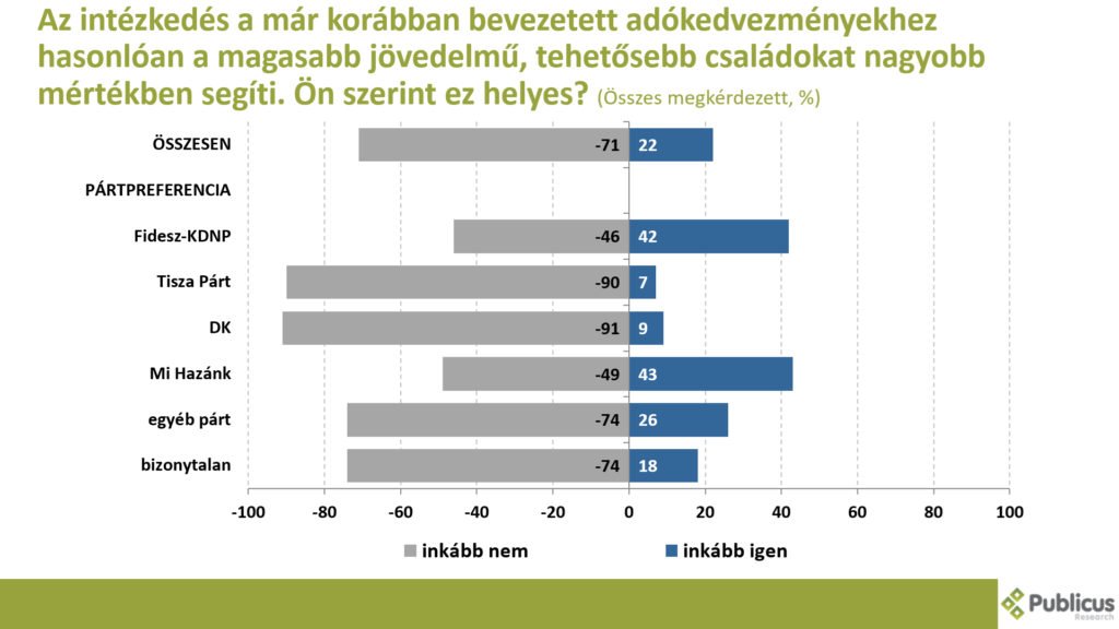 Az intézkedés a már korábban bevezetett adókedvezményekhez hasonlóan a magasabb jövedelmű, tehetősebb családokat nagyobb mértékben segíti. Tízből hét (71 százalék) megkérdezett szerint inkább ez nem helyes. Így látja a DK szavazók 91 százaléka, a Tisza Párt szavazóinak a 90 százaléka, a bizonytalan szavazók 74 százaléka, illetve a Fidesz szavazók 46 százaléka.