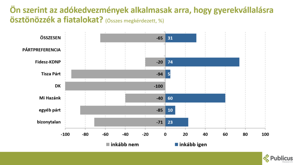 A válaszadók kétharmada (65 százalék) szerint az adókedvezmények inkább nem alkalmasak arra, hogy gyerekvállalásra ösztönözzék a fiatalokat. Így gondolja a DK szavazók 100 százaléka, a Tisza Párt szavazóinak a 94 százaléka, a bizonytalan szavazók 71 százaléka, illetve a Fidesz szavazók 20 százaléka.