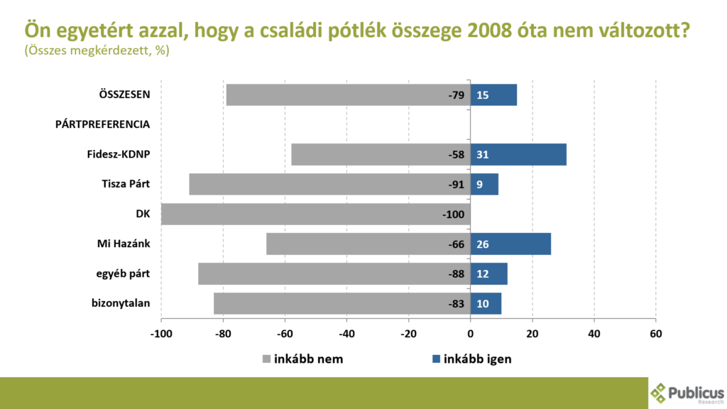 Tízből nyolc (79 százalék) megkérdezett inkább nem ért egyet azzal, hogy a családi pótlék összege 2008 óta nem változott. Így nyilatkozott a DK szavazók 100 százaléka, a Tisza Párt szavazóinak a 91 százaléka, a bizonytalan szavazók 83 százaléka, illetve a Fidesz szavazók 58 százaléka.