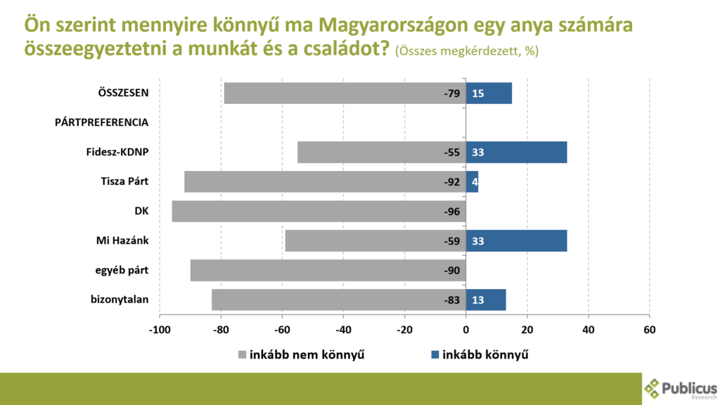 Tízből nyolc (79 százalék) válaszadó szerint inkább nem könnyű ma Magyarországon egy anya számára összeegyeztetni a munkát és a családot. Így nyilatkozott a DK szavazók 96 százaléka, a Tisza Párt szavazóinak a 92 százaléka, a bizonytalan szavazók 83 százaléka, illetve a Fidesz szavazók 55 százaléka.