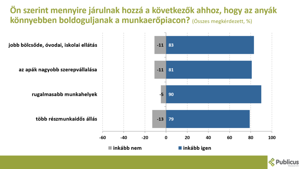 Tízből kilenc (90 százalék) válaszadó szerint a rugalmasabb munkahelyek, illetve tízből közel nyolc megkérdezett szerint a jobb bölcsődei, óvodai, iskolai ellátás (83 százalék), az apák nagyobb szerepvállalása (81 százalék), illetve a több részmunkaidős állás (79 százalék) azok, amelyek inkább hozzájárulnak ahhoz, hogy az anyák könnyebben boldoguljanak a munkaerőpiacon.