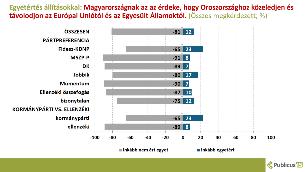 Tízből kilenc (89 százalék) ellenzéki szavazó, illetve a bizonytalan szavazók háromnegyede (75 százalék) és a Fidesz szavazók kétharmada (65 százalék) inkább nem ért egyet azzal az állítással, hogy Magyarországnak az az érdeke, hogy Oroszországhoz közeledjen és távolodjon az Európai Uniótól és az Egyesült Államoktól.