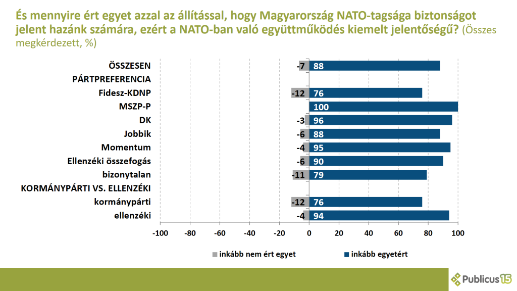 Tízből kilenc (88 százalék) válaszadó inkább egyetért azzal az állítással, hogy Magyarország NATO-tagsága biztonságot jelent hazánk számára, ezért a NATO-ban való együttműködés kiemelt jelentőségű. Így gondolja az ellenzéki szavazók 94 százaléka, a bizonytalan szavazók 79 százaléka és a Fidesz szavazók 76 százaléka.