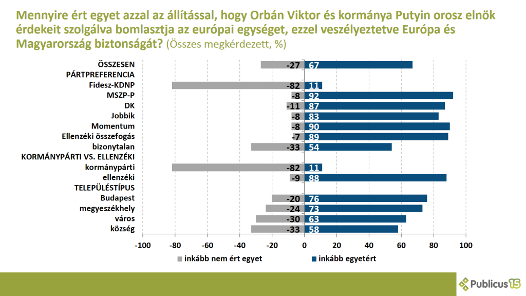 A megkérdezettek kétharmada inkább egyetért azzal az állítással, hogy Orbán Viktor és kormánya Putyin orosz elnök érdekeit szolgálva bomlasztja az európai egységet, ezzel veszélyeztetve Európa és Magyarország biztonságát.