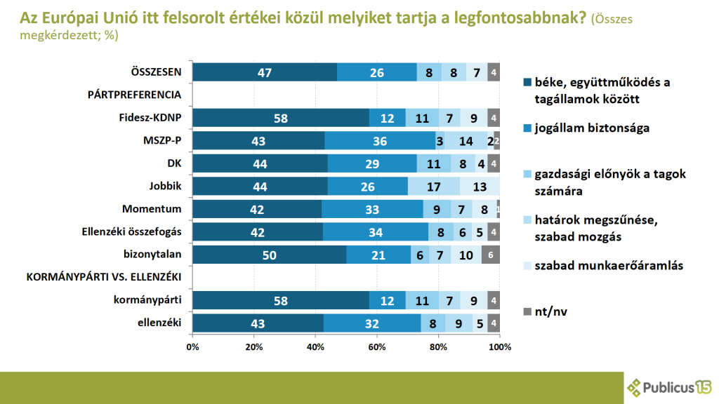 Leginkább a Fidesz szavazók és a bizonytalan szavazók (58 és 50 százalék) látják úgy, hogy az EU legfontosabb értéke a béke és az együttműködés. A jogállam biztonságát pedig leginkább az ellenzéki szavazók (32 százalék) emelték ki.