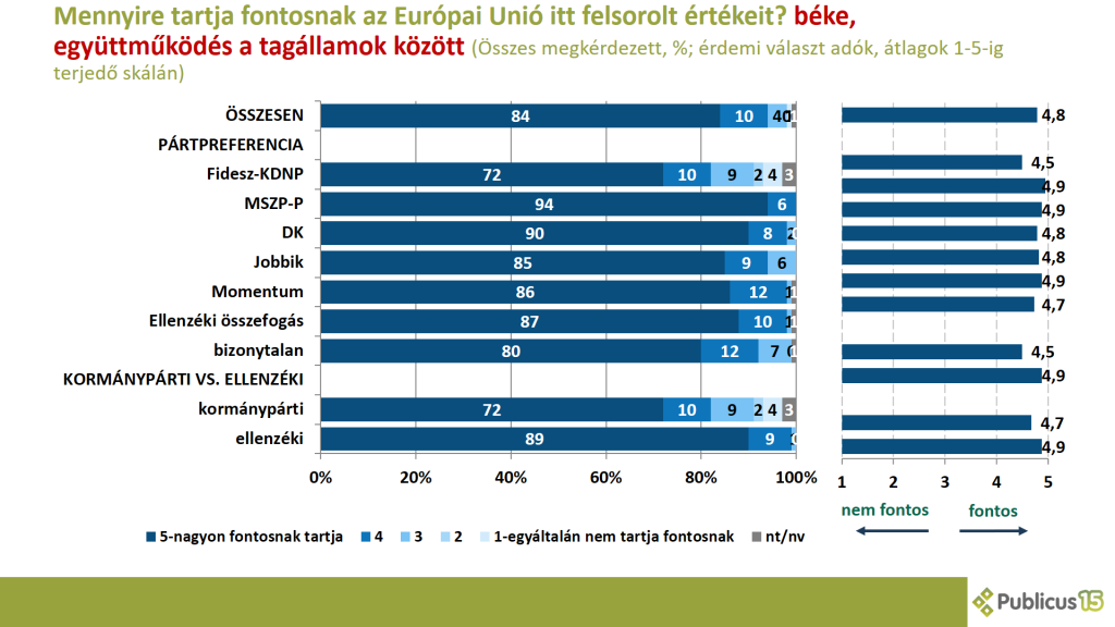 A megkérdezettek túlnyomó többsége (84 százalék) nagyon fontosnak tartja az EU értékei közül a békét, az együttműködést a tagállamok között. Ezt mondta tízből kilenc (89 százalék) ellenzéki szavazó, tízből nyolc (80 százalék) bizonytalan szavazó, illetve tízből hét (72 százalék) Fidesz szavazó.