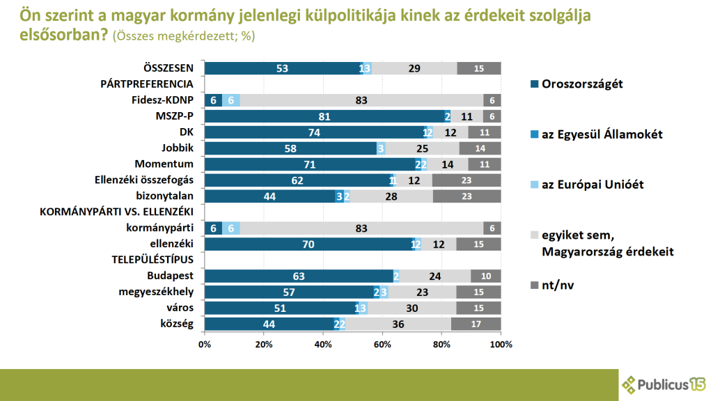 Tízből hét (70 százalék) ellenzéki szavazó, illetve a bizonytalan szavazók 44 százaléka és a Fidesz szavazók 6 százaléka szerint a magyar kormány jelenlegi külpolitikája Oroszország érdekeit szolgálja elsősorban.