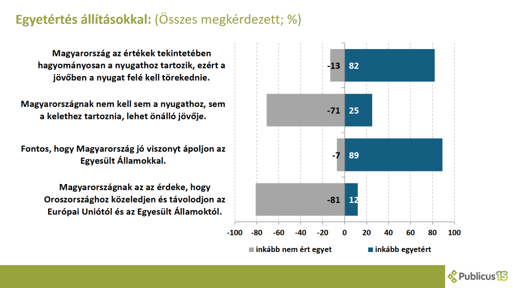 Tízből nyolc (81 százalék) megkérdezett inkább nem ért egyet azzal, hogy Magyarországnak az az érdeke, hogy Oroszországhoz közeledjen és távolodjon az Európai Uniótól és az Egyesült Államoktól.