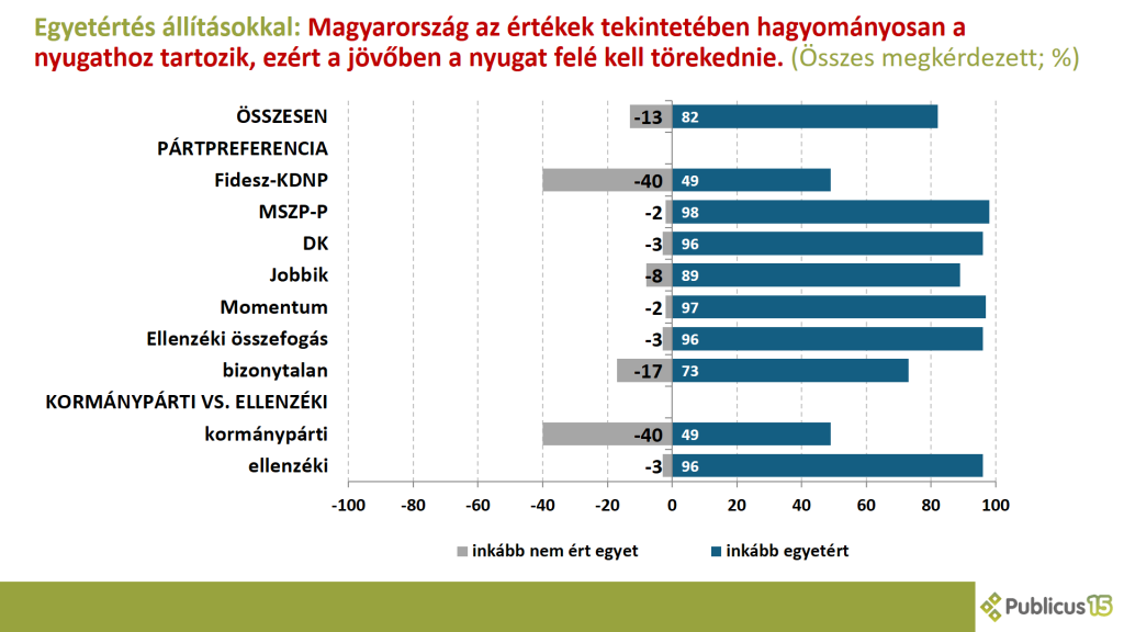 Az ellenzéki szavazók 96 százaléka, a bizonytalan szavazók 73 százaléka, illetve a Fidesz szavazók 49 százaléka szerint Magyarország az értékek tekintetében hagyományosan a nyugathoz tartozik, ezért a jövőben a nyugat felé kell törekednie. Egyúttal a kormánypárti szavazók 40 százaléka, illetve a bizonytalan szavazók 17 százaléka azonban inkább nem értett egyet ezzel az állítással.