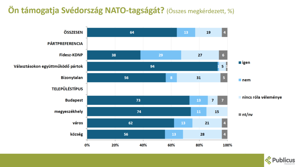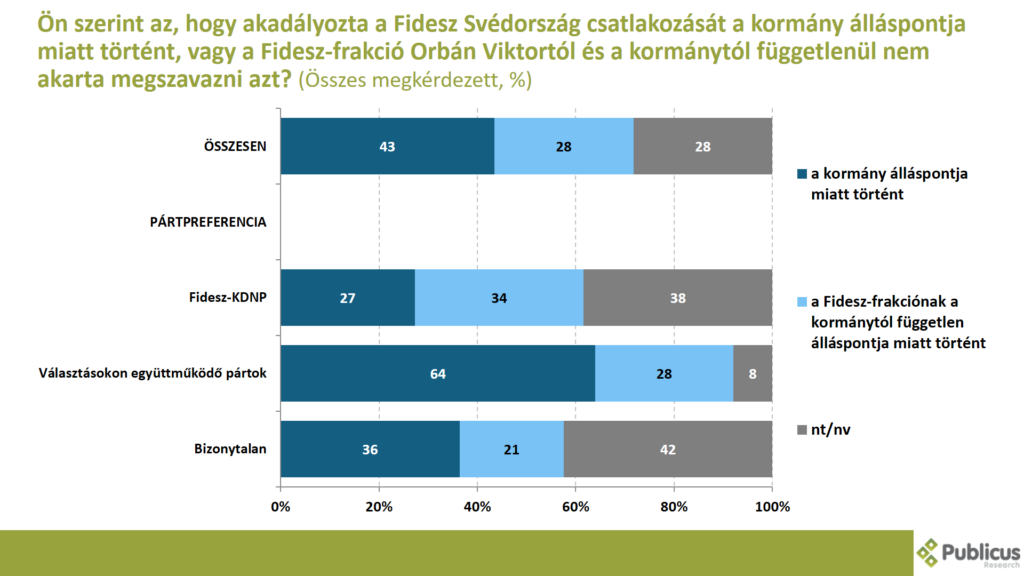 Tízből négy (43 százalék) válaszadó szerint az, hogy akadályozza a Fidesz Svédország csatlakozását a NATO-hoz, az a kormány álláspontja miatt történik. Így gondolja a választásokon együttműködő ellenzéki pártok szavazóinak a kétharmada (64 százalék), tízből közel négy (36 százalék) bizonytalan szavazó, illetve tízből közel három (27 százalék) Fidesz szavazó.