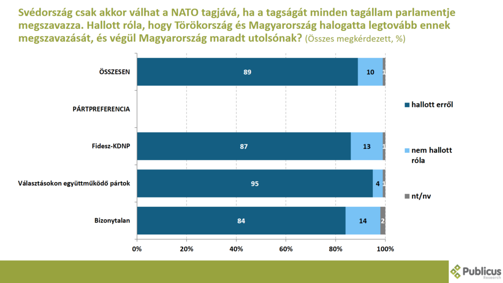 Tízből kilenc (89 százalék) megkérdezett hallott róla, hogy Törökország és Magyarország halogatta legtovább ennek megszavazását, és végül Magyarország maradt utolsónak. Így nyilatkozott a választásokon együttműködő ellenzéki pártok szavazói közül szinte az összes (95 százalék), tízből kilenc (87 százalék) Fidesz szavazó, illetve a bizonytalan szavazók jelentős többsége (84 százalék).