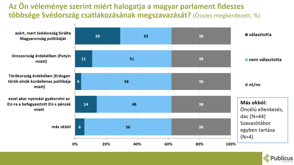 11 százalék szerint Oroszország érdekében (Putyin miatt), 4 százalék szerint pedig Törökország érdekében (Erdogan török elnök kurdellenes politikája miatt) halogatja a magyar parlament fideszes többsége a skandináv állam csatlakozását a katonai szövetséghez.