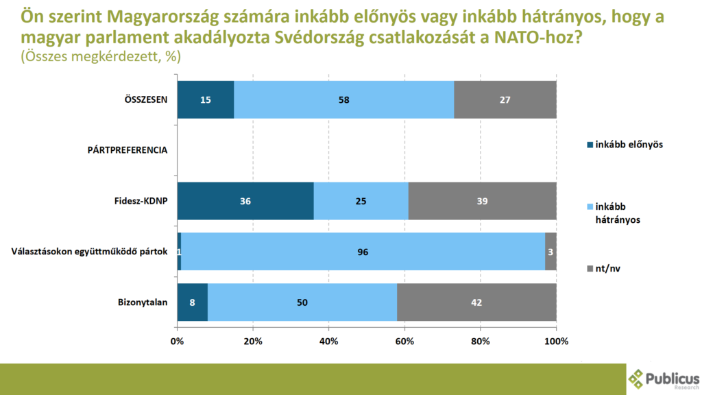 Tízből hat (58 százalék) megkérdezett szerint inkább hátrányos az Magyarország számára, hogy a magyar parlament akadályozza Svédország csatlakozását a NATO-hoz. Így nyilatkozott a választásokon együttműködő ellenzéki pártok szavazói közül szinte az összes (96 százalék), minden második (50 százalék) bizonytalan szavazó, illetve a Fidesz szavazók negyede (25 százalék)