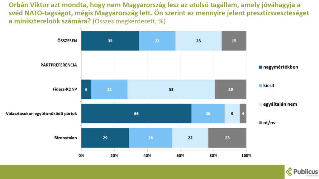 Orbán Viktor azt mondta, hogy nem Magyarország lesz az utolsó tagállam, amely jóváhagyja a svéd NATO-tagságot, mégis Magyarország lett. A válaszadók harmada (35 százalék) szerint ez nagymértékben jelent presztízsveszteséget a miniszterelnök számára. Így gondolja a választásokon együttműködő ellenzéki pártok szavazóinak a kétharmada (64 százalék), tízből három (30 százalék) bizonytalan szavazó, illetve a Fidesz szavazók 6 százaléka.