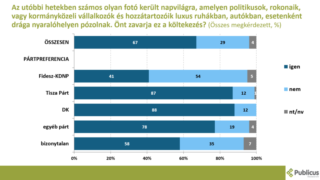 Az utóbbi hetekben számos olyan fotó került napvilágra, amelyen politikusok, rokonaik, vagy kormányközeli vállalkozók és hozzátartozóik luxus ruhákban, autókban, esetenként drága nyaralóhelyen pózolnak. A válaszadók kétharmadát zavarja ez a költekezés.