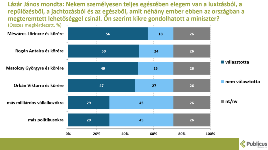 Lázár János mondta: „Nekem személyesen teljes egészében elegem van a luxizásból, a repülőzésből, a jachtozásból és az egészből, amit néhány ember ebben az országban a megteremtett lehetőséggel csinál.” Tízből közel hat válaszadó szerint Lázár Mészáros Lőrincre és körére, minden második megkérdezett szerint Rogán Antal és körére, illetve közel ugyanilyen arányban mondták azt, hogy Matolcsy György és körére gondolhatott az építési és közlekedési miniszter.
