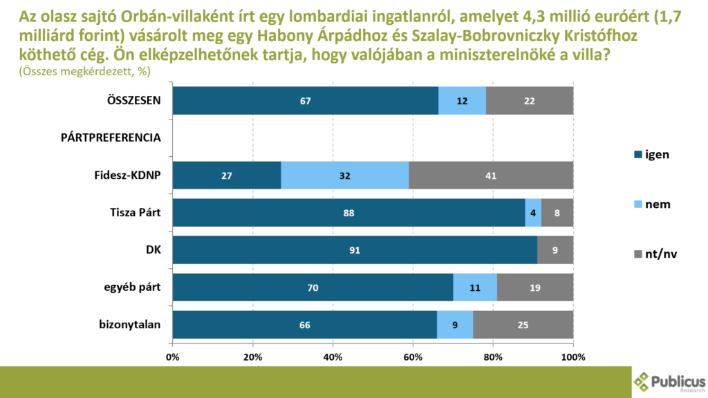 A válaszadók kétharmada (67 százalék) elképzelhetőnek tartja, hogy valójában a miniszterelnöké a villa. Így nyilatkozott tízből közel kilenc DK (91 százalék), illetve Tisza Párt szavazó (88 százalék), a bizonytalan szavazók 66 százaléka, illetve a Fidesz szavazók 27 százaléka.
