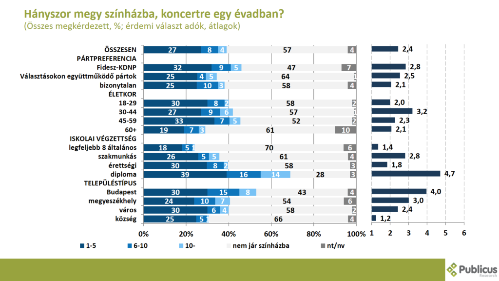 A válaszadók átlagosan 2,4-szer járnak színházba, koncertre egy évadban. A legtöbbet a diplomások (4,7), a Budapestiek (4,0), illetve a 30-44 közötti korosztály (3,2) jár ilyen eseményekre. A pártpolitikát nézve: a Fidesz szavazók 2,8-szor, a választásokon együttműködő ellenzéki pártok szavazói 2,5-ször, a bizonytalan szavazók pedig 2,1-szer járnak átlagosan színházba vagy koncertre egy évadban.