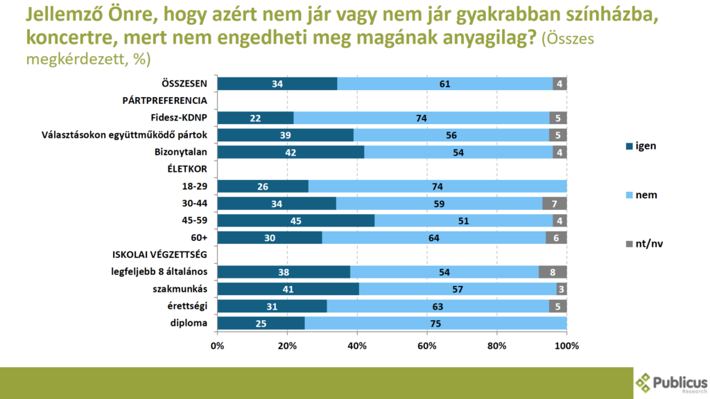 A megkérdezettek harmadára (34 százalék) jellemző az, hogy azért nem jár vagy nem jár gyakrabban színházba, koncertre, mert nem engedheti meg magának anyagilag. Leginkább a 45-49 év közöttiek (45 százalék) és a szakmunkások (41 százalék) nyilatkoztak így. A pártpreferenciákat nézve tízből négy (42 százalék) bizonytalan szavazó, a választásokon együttműködő ellenzéki pártok szavazói közül szintén közel ennyi (39 százalék), illetve a Fidesz szavazók közel negyede (22 százalék) mondta azt, hogy ez jellemző rá.