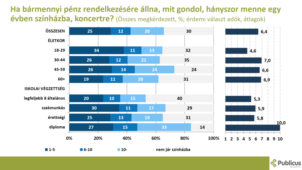 Ha bármennyi pénz a rendelkezésére állna, a válaszadók átlagosan 6,4-szer mennének egy évben színházba vagy koncertre. A diplomások 10-szer, a 30-44 közöttiek pedig 7-szer tennének így egy évben.