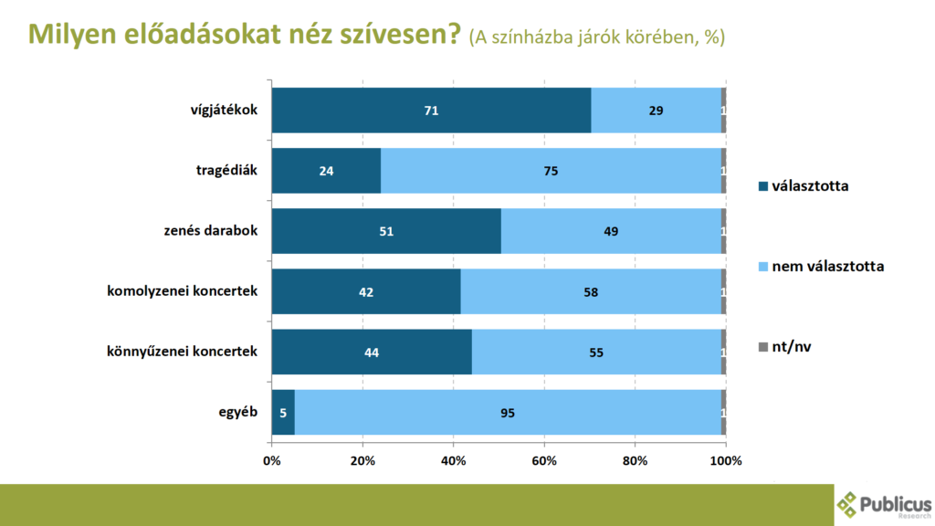 A színházba járok körében tízből hét válaszadó (71 százalék) mondta azt, hogy vígjátékokat, tízből öt (51 százalék) hogy zenés darabokat, tízből négy könnyűzenei koncerteket (44 százalék), illetve komolyzenei koncerteket (42 százalék) néz szívesen.