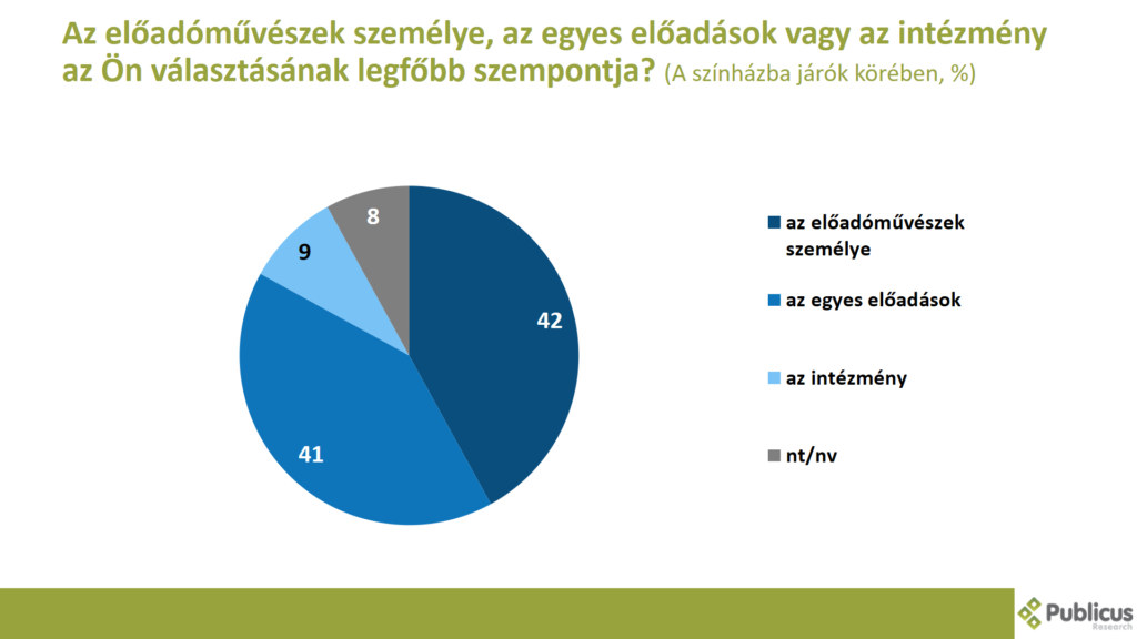 Szintén a színházba járók körében tízből négy (41 százalék) megkérdezettnek az egyes előadások, tízből négy (42 százalék) válaszadónak az előadóművészek személye a választásának a legfőbb szempontja. Minden tizedik (9 százalék) válaszadó az intézményt nevezte meg.