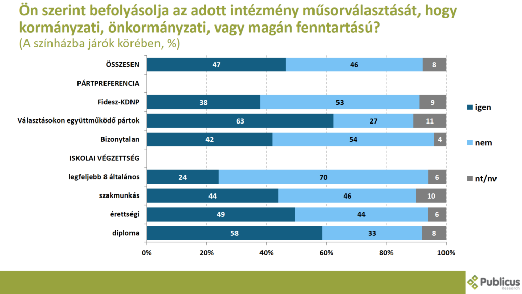Közel minden második (47 százalék) megkérdezett szerint befolyásolja az adott intézmény műsorválasztását, hogy kormányzati, önkormányzati, vagy magán fenntartású. Így nyilatkozott a választásokon együttműködő ellenzéki pártok szavazóinak közel kétharmada (63 százalék), tízből négy (42 százalék) bizonytalan szavazó, illetve tízből közel négy (38 százalék) Fidesz szavazó. Iskolai végzettséget nézve leginkább a diplomások (58 százalék) és az érettségivel rendelkezők (49 százalék) mondták ezt.