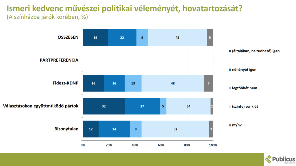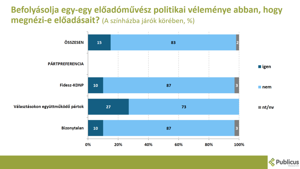 Tízből nyolc (83 százalék) megkérdezett mondta azt, hogy nem befolyásolja egy-egy előadóművész politikai véleménye abban, hogy megnézi-e előadásait. Így nyilatkozott a Fidesz szavazók közül és a bizonytalan szavazók közül is tízből kilenc (87-87 százalék), illetve a választásokon együttműködő ellenzéki pártok szavazóinak a háromnegyede (73 százalék).