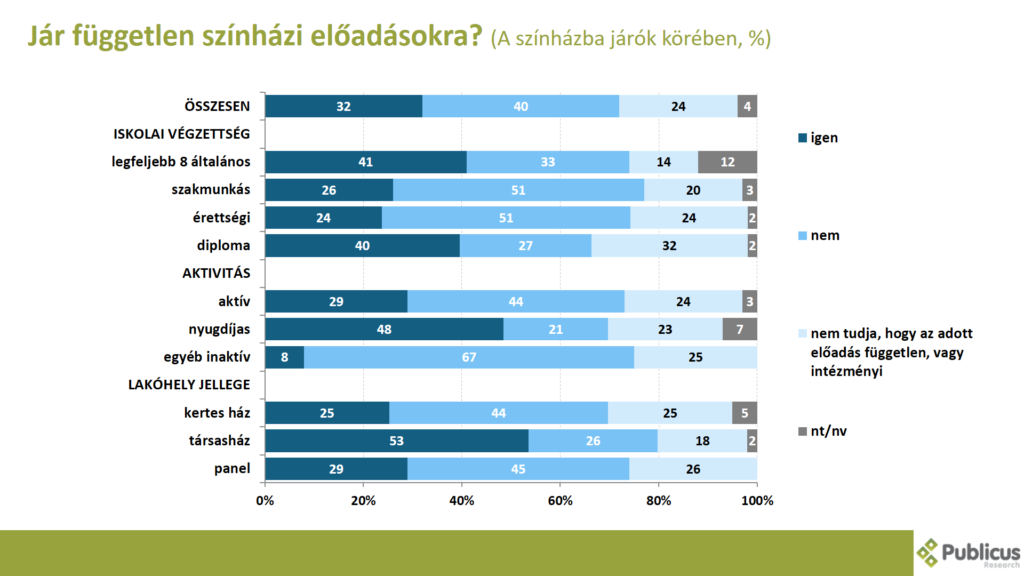 A válaszadók harmada (32 százalék) mondta azt, hogy jár független színházi előadásokra. Leginkább a társasházban élők (53 százalék), a nyugdíjasok (48 százalék), a legfeljebb 8 általánost végzettek (41 százalék) és a diplomások (40 százalék) nyilatkoztak így.