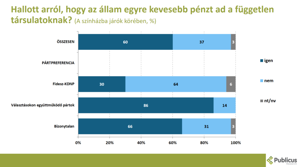 Tízből hat (60 százalék) megkérdezett hallott arról, hogy az állam egyre kevesebb pénzt ad a független társulatoknak. Így nyilatkozott a választásokon együttműködő ellenzéki pártok szavazóinak a túlnyomó többsége (87 százalék), a bizonytalan szavazók kétharmada (66 százalék), illetve tízből három (30 százalék) bizonytalan szavazó.