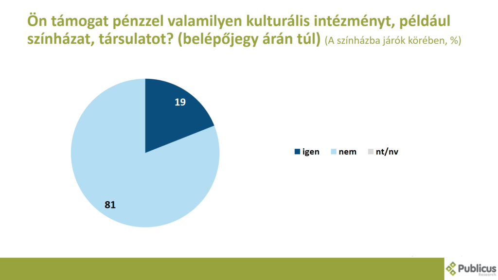 Tízből nyolc válaszadó mondta azt, hogy támogat pénzzel valamilyen kulturális intézményt, például színházat, társulatot (belépőjegy árán túl). A megkérdezettek közel kétharmada örülne, ha adójának egy meghatározott százalékát kulturális intézmények támogatására fordíthatná.