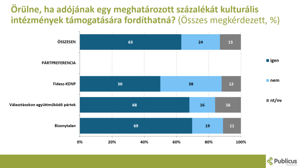 A megkérdezettek közel kétharmada (63 százalék) örülne, ha adójának egy meghatározott százalékát kulturális intézmények támogatására fordíthatná. Így nyilatkozott tízből hét bizonytalan szavazó (69 százalék), a választásokon együttműködő ellenzéki pártok szavazói közül szintén tízből hét (68 százalék) illetve minden második (50 százalék) Fidesz szavazó.