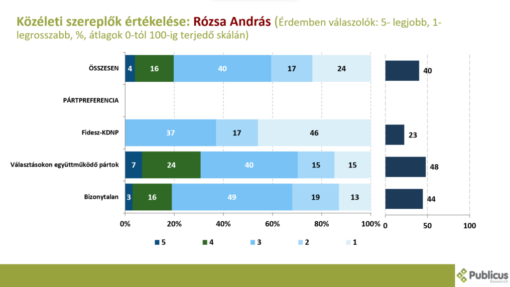 Rózsa András népszerűsége (21 százalékos ismertség mellett) a választásokon együttműködő ellenzéki pártok szavazóinál átlagosan 48 százalékpont, a bizonytalan szavazóknál 44 százalékpont, a Fidesz szavazóknál pedig 23 százalékpont.