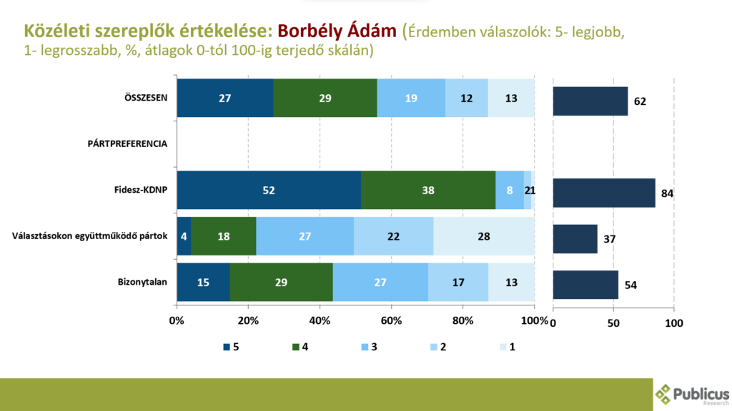 Borbély Ádám népszerűsége (37 százalékos ismertség mellett) a Fidesz szavazóknál átlagosan 84 százalékpont, a bizonytalan szavazóknál 54 százalékpont, a választásokon együttműködő ellenzéki pártok szavazóinál pedig 37 százalékpont.