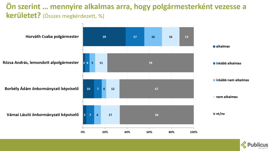 Tízből közel hat (56 százalék) megkérdezett mondta azt, hogy Horváth Csaba szerintük vagy alkalmas (39 százalék), vagy pedig inkább alkalmas (17 százalék) arra, hogy polgármesterként vezesse a kerületet. A válaszadók harmada (32 százalék) gondolja úgy, hogy vagy nem alkalmas, vagy pedig inkább nem alkalmas a kerület vezetésére (16-16 százalék).